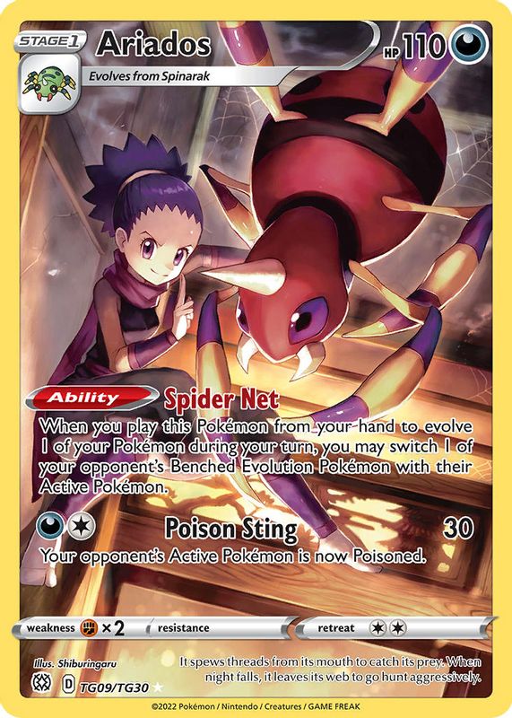 The Ariados 2022 Sword & Shield: Brilliant Stars #TG09/TG30 Trainer Gallery card in Raw TCG (Near Mint) condition has moved up $0.59 (+42.1%) in the last 30 days and was last sold for $1.99 .