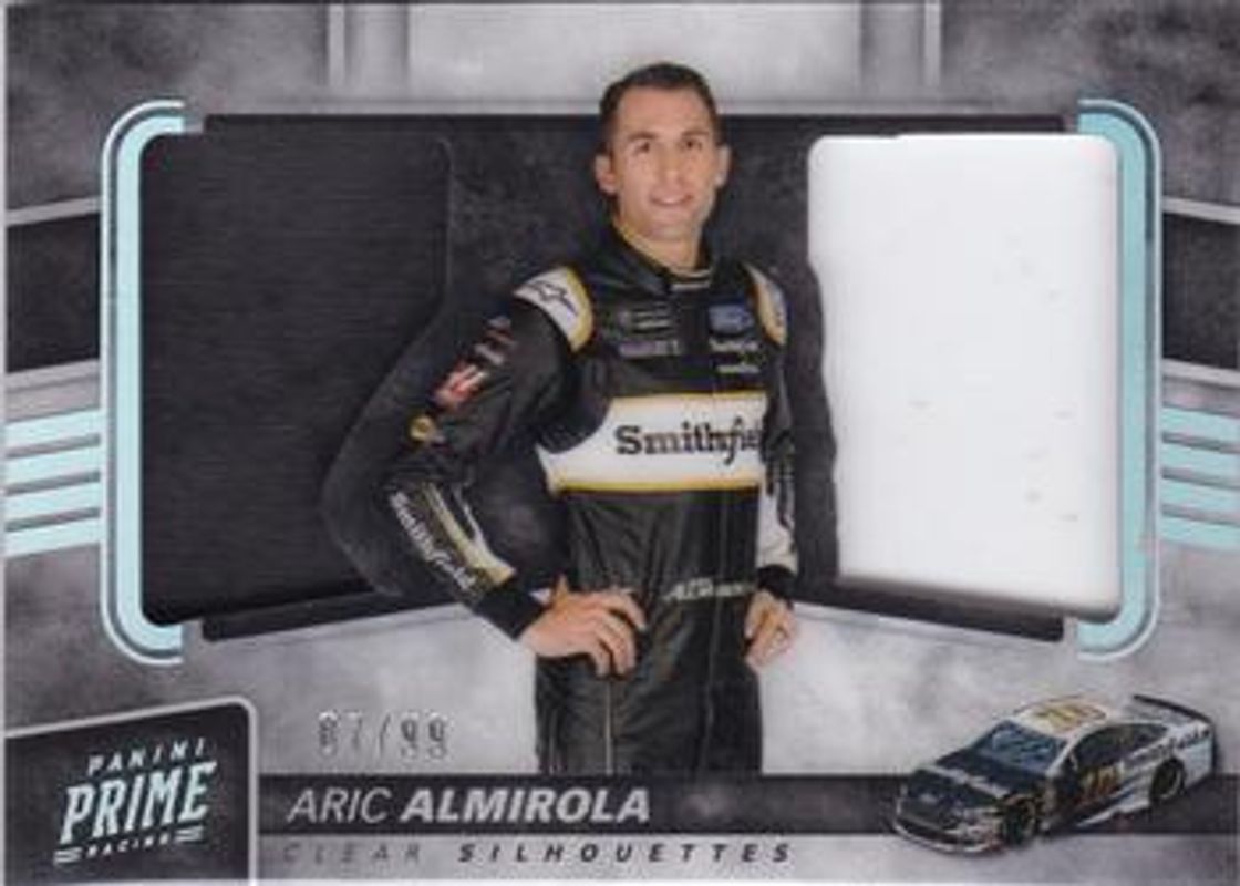 The Aric Almirola 2018 Prime NASCAR #CS-AA Clear Silhouettes Dual /99 card is 1 of 71 Aric Almirola's card variations in the 2018 Prime NASCAR set being tracked by Sports Card Investor, including #78 Base /50, #45 Base /50, #11 Base /50, #78 Holo Gold /25, and #45 Holo Gold /25.