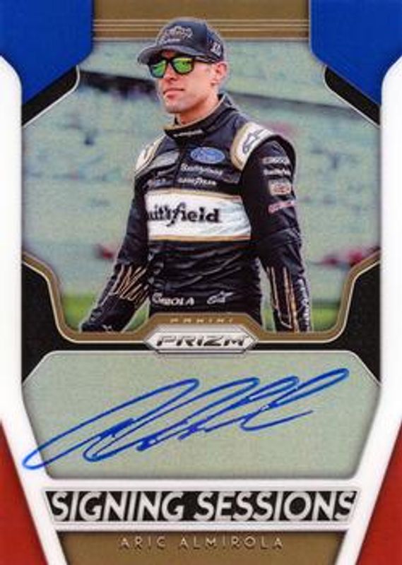 The Aric Almirola 2019 Prizm NASCAR #SS-AA Signing Sessions Red White & Blue card is 1 of 53 Aric Almirola's card variations in the 2019 Prizm NASCAR set being tracked by Sports Card Investor, including #70 Base, #8 Base, #87 Base, #70 Camo, and #8 Camo.