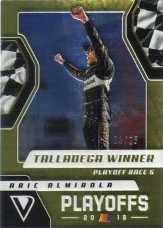 The Aric Almirola 2019 Victory Lane NASCAR #55 Gold /25 card is 1 of 69 Aric Almirola's card variations in the 2019 Victory Lane NASCAR set being tracked by Sports Card Investor, including #8 Base, #55 Base, #8 Gold /25, #55 Black /1, and #8 Black /1.