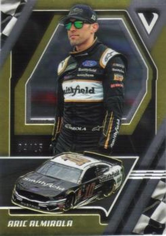 The Aric Almirola 2019 Victory Lane NASCAR #8 Gold /25 card is 1 of 69 Aric Almirola's card variations in the 2019 Victory Lane NASCAR set being tracked by Sports Card Investor, including #8 Base, #55 Base, #55 Gold /25, #55 Black /1, and #8 Black /1.