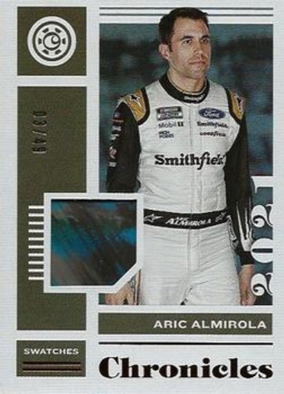 The Aric Almirola 2021 Chronicles NASCAR #CS-AA Chronicles Swatches - Red /49 card is 1 of 86 Aric Almirola's card variations in the 2021 Chronicles NASCAR set being tracked by Sports Card Investor, including Absolute, Absolute Autographs, Chronicles Swatches, Cornerstones Materials Signatures, and Crusade.