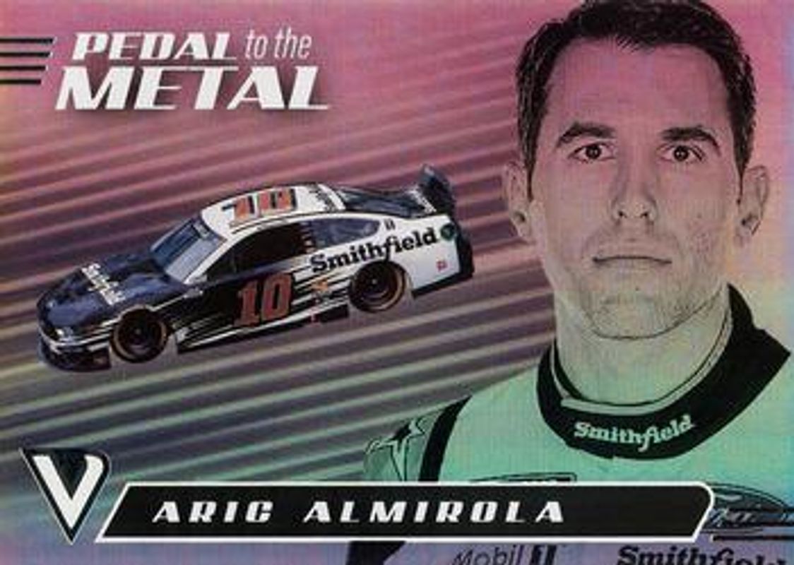 The Aric Almirola 2021 Chronicles NASCAR #18 Pedal to the Metal card is 1 of 86 Aric Almirola's card variations in the 2021 Chronicles NASCAR set being tracked by Sports Card Investor, including Absolute, Absolute Autographs, Chronicles Swatches, Cornerstones Materials Signatures, and Crusade.