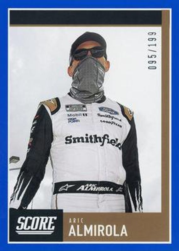The Aric Almirola 2021 Chronicles NASCAR #14 Score - Blue /199 card is 1 of 86 Aric Almirola's card variations in the 2021 Chronicles NASCAR set being tracked by Sports Card Investor, including Absolute, Absolute Autographs, Chronicles Swatches, Cornerstones Materials Signatures, and Crusade.