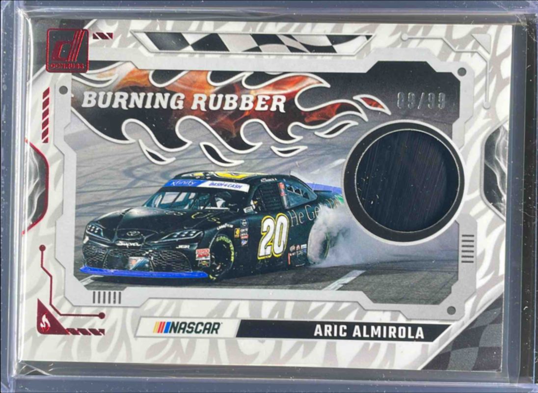 The Aric Almirola 2025 Donruss NASCAR #BRM-AAA Burning Rubber Materials - Red /99 card is 1 of 65 Aric Almirola's card variations in the 2025 Donruss NASCAR set being tracked by Sports Card Investor, including Base, Laser, Red /299, Blue /199, and Lime Green /199.
