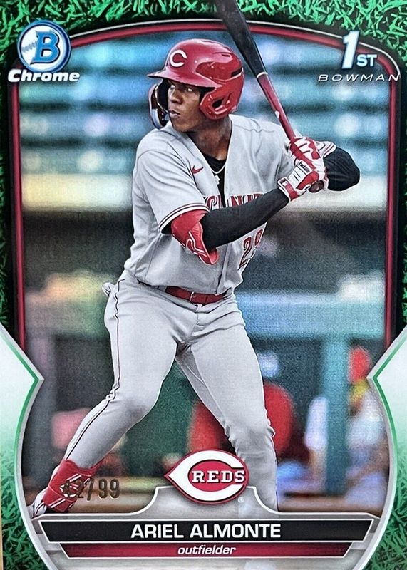 The Ariel Almonte 2023 Bowman #BCP-78 Chrome Prospects - Green Grass Refractor /99 (1st) card in Raw condition has not changed in price in the last 30 days and was last sold for $3.13 .