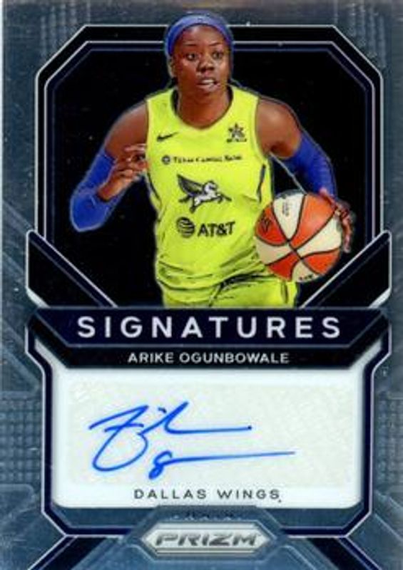 The Arike Ogunbowale 2021 Prizm WNBA #SG-AOG Signatures card is 1 of 78 Arike Ogunbowale's card variations in the 2021 Prizm WNBA set being tracked by Sports Card Investor, including Base, Green, Green Ice, Hyper, and Ice.