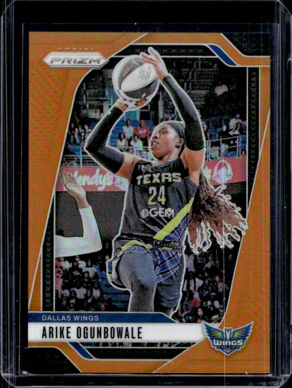 The Arike Ogunbowale 2024 Prizm WNBA #28 Orange /99 card is 1 of 44 Arike Ogunbowale's card variations in the 2024 Prizm WNBA set being tracked by Sports Card Investor, including Base, Blue Velocity, Checkerboard, Green, and Ice.