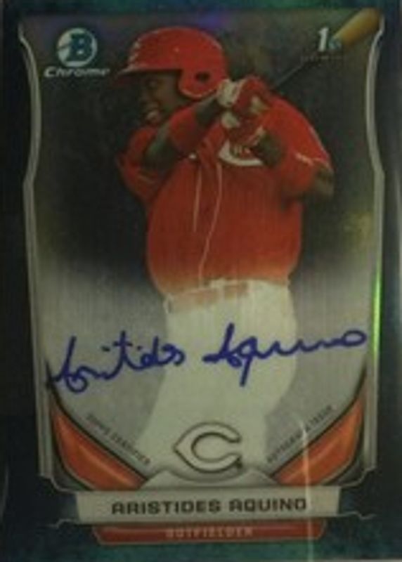 This card is 1 of 14 Aristides Aquino's card variations in the 2014 Bowman Chrome set being tracked by Sports Card Investor, including Prospect Auto (1st), Prospect Auto - Refractor /500 (1st), Prospect Auto - Blue Refractor /150 (1st), Prospect Auto - Green Refractor /75 (1st), and Prospect Auto - Blue Wave Refractor /50 (1st).