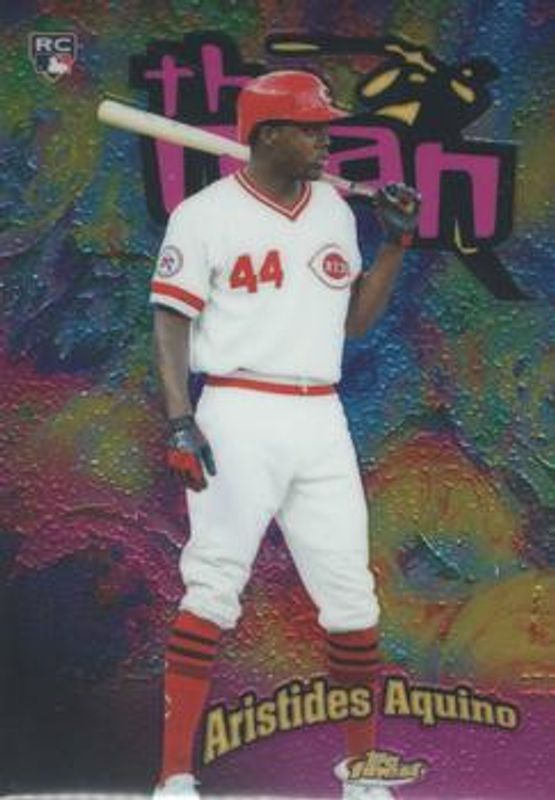 The Aristides Aquino 2020 Topps Finest #FTM-19 1998 The Man Rookie card is 1 of 46 Aristides Aquino's card variations in the 2020 Topps Finest set being tracked by Sports Card Investor, including Base, Refractor, Purple Refractor /250, Blue Refractor /150, and Green Refractor /99.
