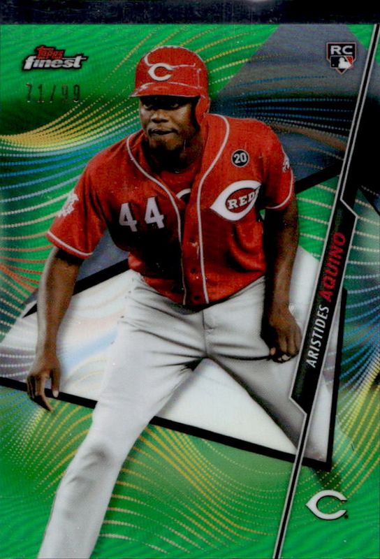 The Aristides Aquino 2020 Topps Finest #21 Green Refractor /99 Rookie card is 1 of 46 Aristides Aquino's card variations in the 2020 Topps Finest set being tracked by Sports Card Investor, including Base, Refractor, Purple Refractor /250, Blue Refractor /150, and Gold Refractor /50.