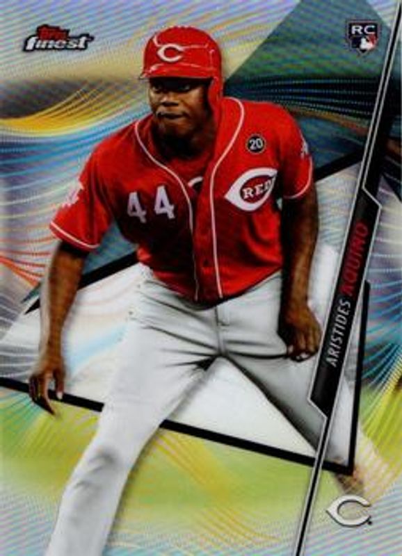 The Aristides Aquino 2020 Topps Finest #21 Refractor Rookie card is 1 of 46 Aristides Aquino's card variations in the 2020 Topps Finest set being tracked by Sports Card Investor, including Base, Purple Refractor /250, Blue Refractor /150, Green Refractor /99, and Gold Refractor /50.