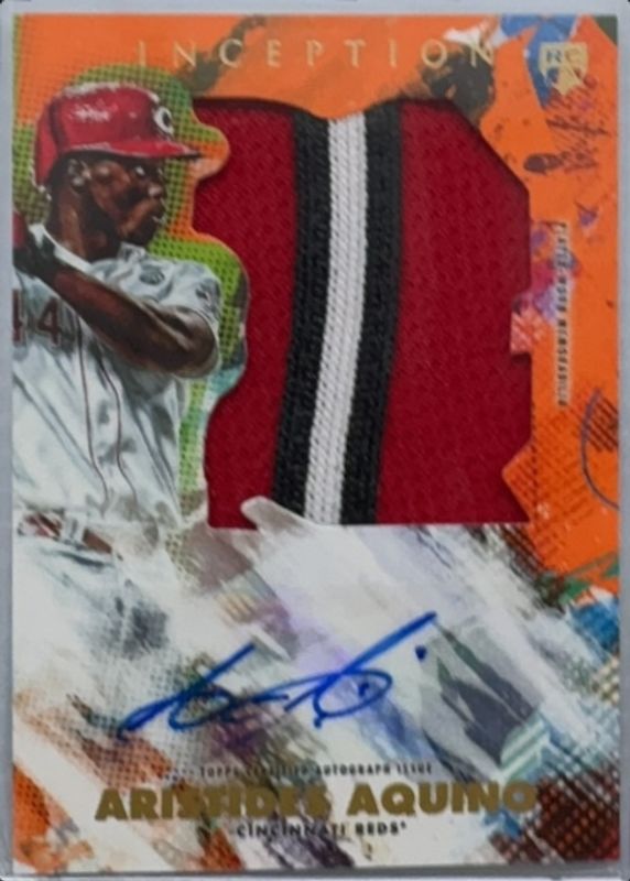 The Aristides Aquino 2020 Topps Inception #IAJP-AA Autographs Jumbo Patch - Orange /25 Rookie card is 1 of 37 Aristides Aquino's card variations in the 2020 Topps Inception set being tracked by Sports Card Investor, including Base, Green, Purple /150, Magenta /99, and Red /99.