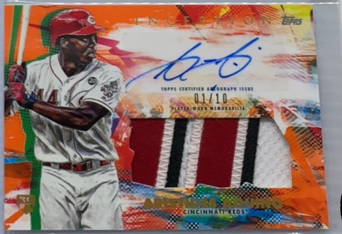 The Aristides Aquino 2020 Topps Inception #IAP-AAQ Autographs Patch - Orange /10 Rookie card is 1 of 37 Aristides Aquino's card variations in the 2020 Topps Inception set being tracked by Sports Card Investor, including Base, Green, Purple /150, Magenta /99, and Red /99.