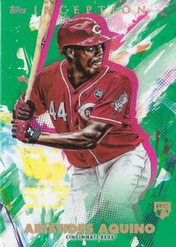 The Aristides Aquino 2020 Topps Inception #45 Green Rookie card is 1 of 37 Aristides Aquino's card variations in the 2020 Topps Inception set being tracked by Sports Card Investor, including Base, Purple /150, Magenta /99, Red /99, and Orange /50.