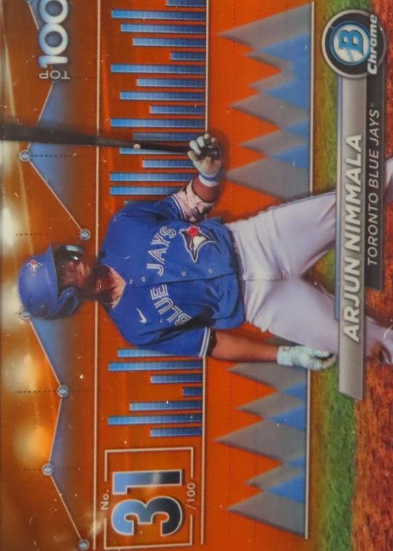 The Arjun Nimmala 2024 Bowman #BTP-31 Bowman Scouts' Top 100 - Orange Refractor /25 card in Raw condition has not changed in price in the last 30 days and was last sold for $29.00 .