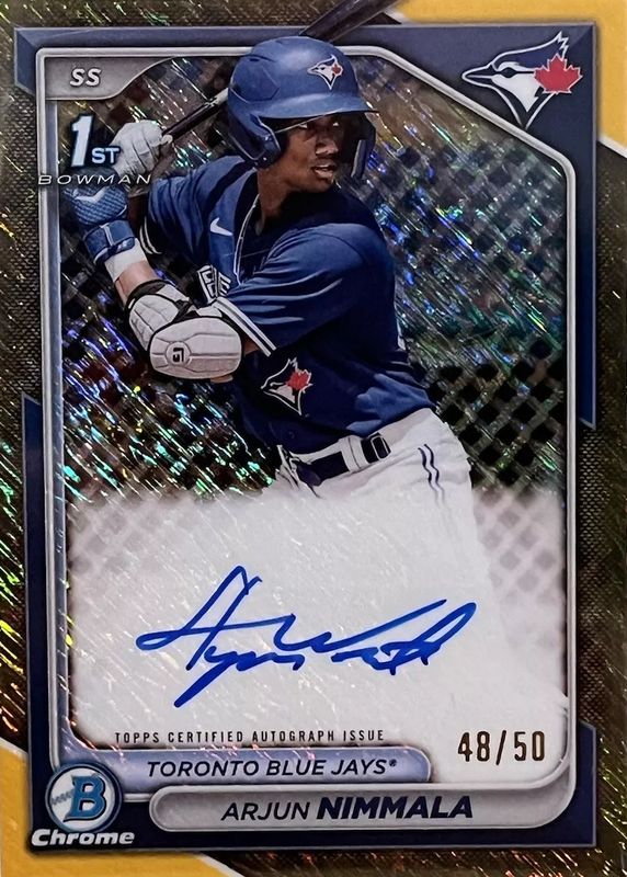 Best Prices Available For Sale of Arjun Nimmala 2024 Bowman #CPA-AN Chrome Prospect Auto - Gold Shimmer Refractor /50 (1st)