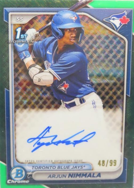 2024 Bowman Arjun Nimmala 1st Chrome Green Shimmer Refractor Auto /99 Blue Jays