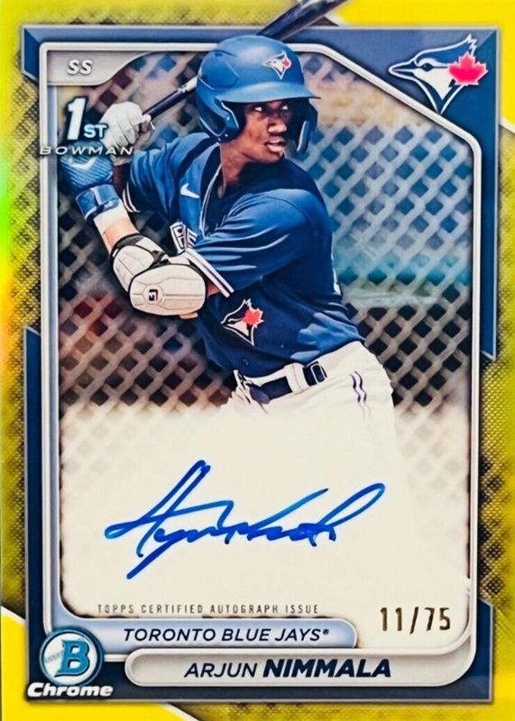 ARJUN NIMMALA AUTO #11/75! 2024 Bowman Chrome Yellow Refractor BLUE JAYS RC 1st