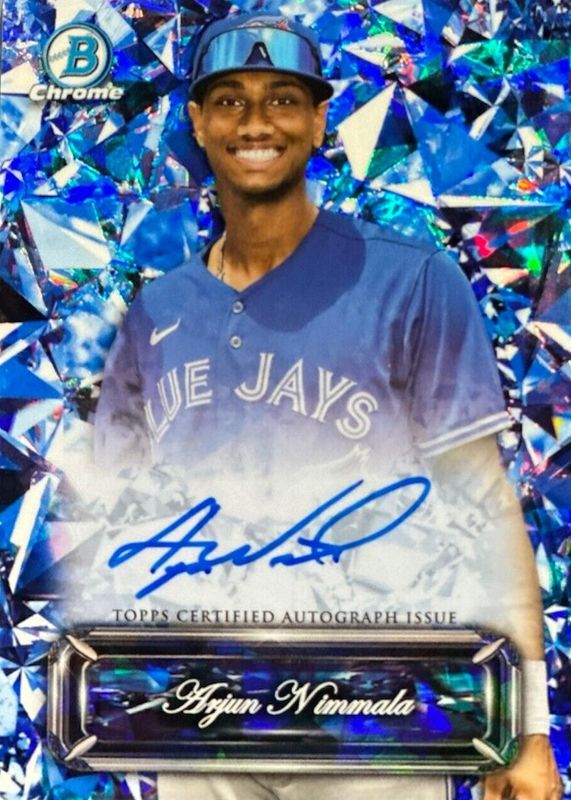 This card is 1 of 9 Arjun Nimmala's card variations in the 2024 Bowman Chrome Sapphire Edition set being tracked by Sports Card Investor, including Sapphire Selections, Sapphire Selections - Gold /50, Sapphire Selections Autographs - Orange /25, Sapphire Selections - Orange /25, and Sapphire Selections Autographs - Red /5.