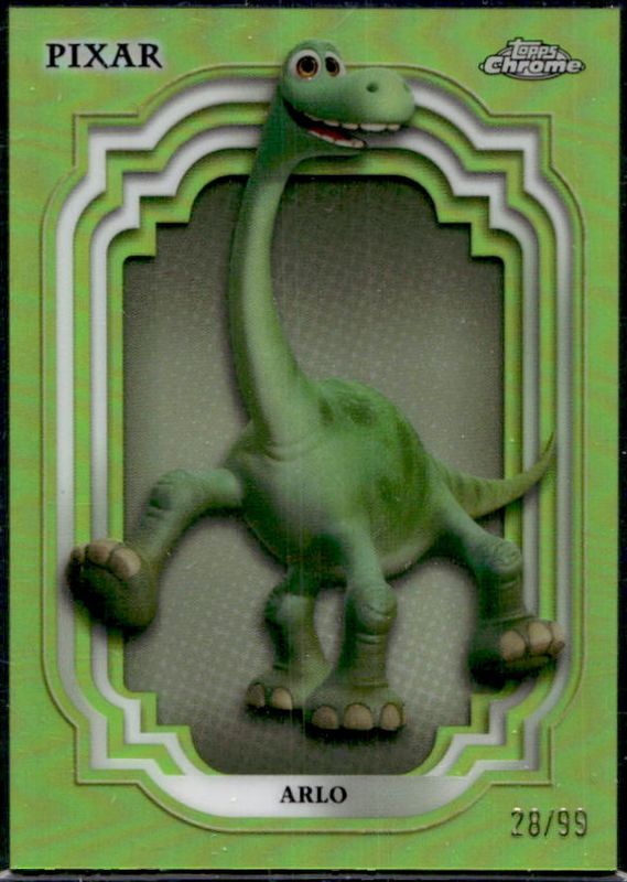 The Arlo 2024 Topps Chrome Disney #164 Green Refractor /99 card is 1 of 15 Arlo's card variations in the 2024 Topps Chrome Disney set being tracked by Sports Card Investor, including Base, Refractor, Purple Refractor /199, Purple & Green Pulsar /150, and Black & White Speckle /101.