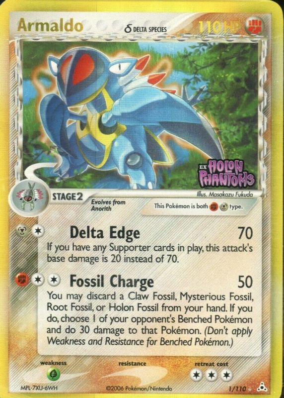 The Armaldo 2006 EX: Holon Phantoms #001/110 Reverse Holo card in Raw TCG (Near Mint) condition has moved up $10.67 (+82.1%) in the last 30 days and was last sold for $23.66 .