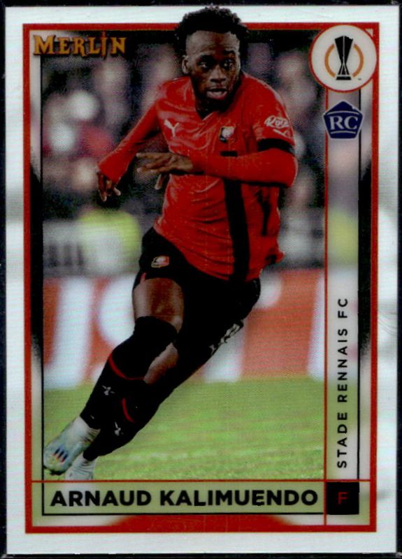 The Arnaud Kalimuendo 2022 Topps Merlin Chrome UEFA Club Competitions #136 Refractor Rookie card is 1 of 26 Arnaud Kalimuendo's card variations in the 2022 Topps Merlin Chrome UEFA Club Competitions set being tracked by Sports Card Investor, including Aqua Prism Refractor, Vintage Merlin Refractor, Rose Gold Shimmer Refractor /299, Pink Mojo Refractor /275, and Atomic Refractor /250.