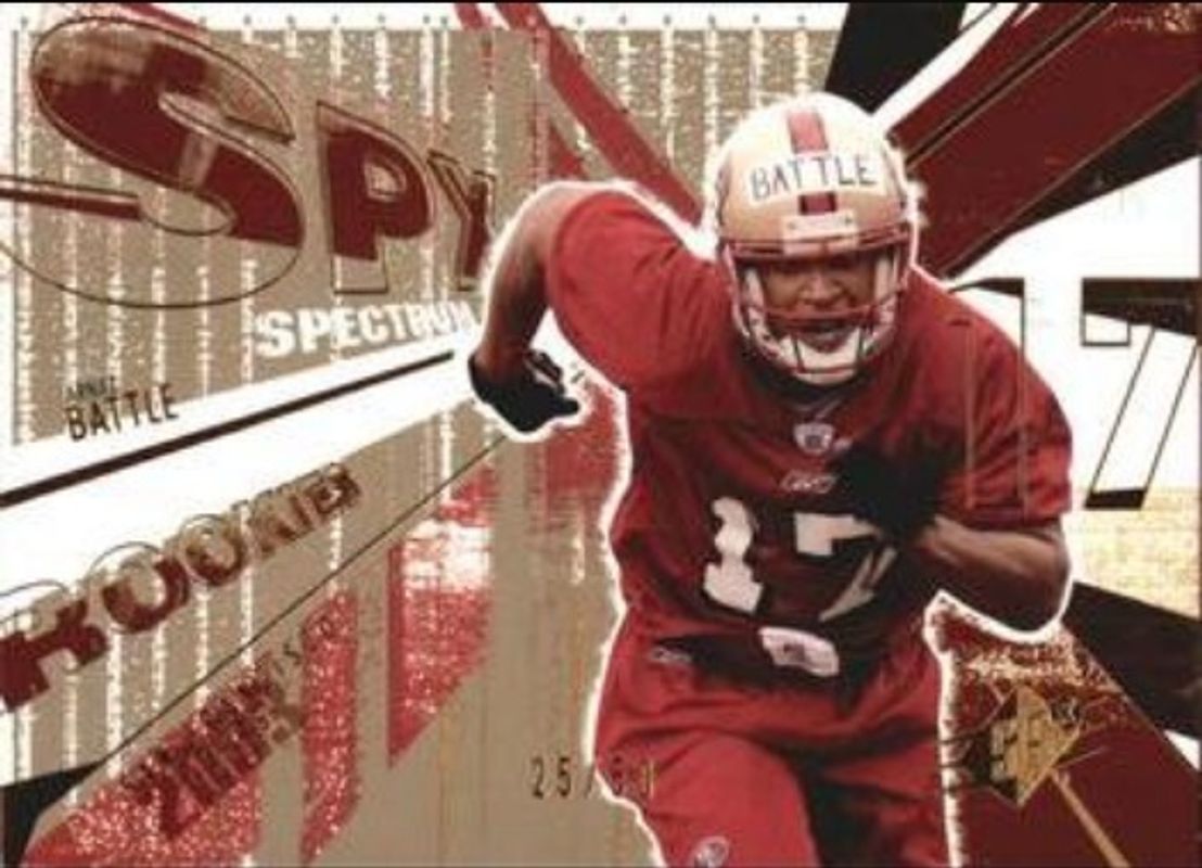 The Arnaz Battle 2003 SPx #152 Spectrum /25 Rookie card is 1 of 2 Arnaz Battle's card variations in the 2003 SPx set being tracked by Sports Card Investor, including Base /1100.