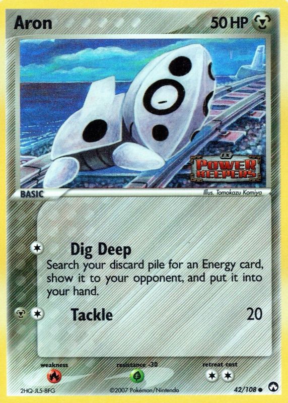 The Aron 2007 EX: Power Keepers #042/108 Reverse Holo card in Raw TCG (Lightly Played) condition has not changed in price in the last 30 days and was last sold for $6.59 .