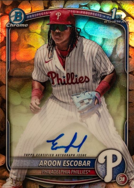 This card is 1 of 88 Aroon Escobar's card variations in the 2025 Bowman set being tracked by Sports Card Investor, including Chrome Prospects (1st), Chrome Prospects - Gumball Refractor (1st), Chrome Prospects - Mini Diamond Refractor (1st), Chrome Prospects - Peanuts Refractor (1st), and Chrome Prospects - Pearl Refractor (1st).
