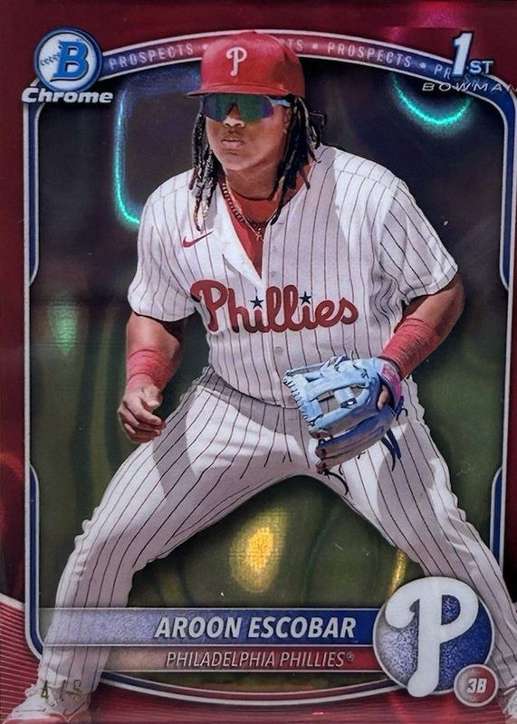 This card is 1 of 88 Aroon Escobar's card variations in the 2025 Bowman set being tracked by Sports Card Investor, including Chrome Prospects (1st), Chrome Prospects - Gumball Refractor (1st), Chrome Prospects - Mini Diamond Refractor (1st), Chrome Prospects - Peanuts Refractor (1st), and Chrome Prospects - Pearl Refractor (1st).
