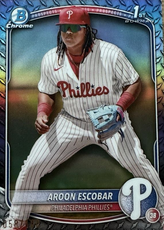 This card is 1 of 88 Aroon Escobar's card variations in the 2025 Bowman set being tracked by Sports Card Investor, including Chrome Prospects (1st), Chrome Prospects - Gumball Refractor (1st), Chrome Prospects - Mini Diamond Refractor (1st), Chrome Prospects - Peanuts Refractor (1st), and Chrome Prospects - Pearl Refractor (1st).