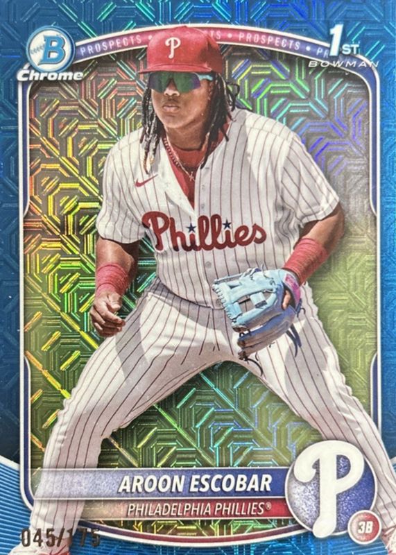 This card is 1 of 15 Aroon Escobar's card variations in the 2025 Bowman Mega Box set being tracked by Sports Card Investor, including Chrome Prospects (1st), Chrome Prospects - Fuchsia Refractor /299 (1st), Chrome Prospects - Burgundy Refractor /275 (1st), Chrome Prospects - Purple Refractor /250 (1st), and Chrome Prospects - Pink Refractor /199 (1st).