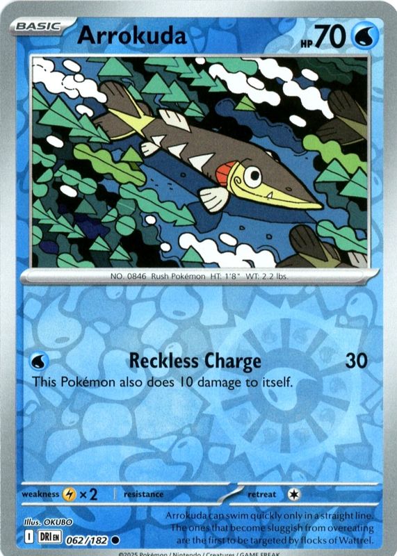 The Arrokuda 2025 Scarlet & Violet: Destined Rivals #062/182 Reverse Holo card in Raw TCG (Near Mint) condition has moved up $0.16 (+11.1%) in the last 30 days and was last sold for $1.60 .
