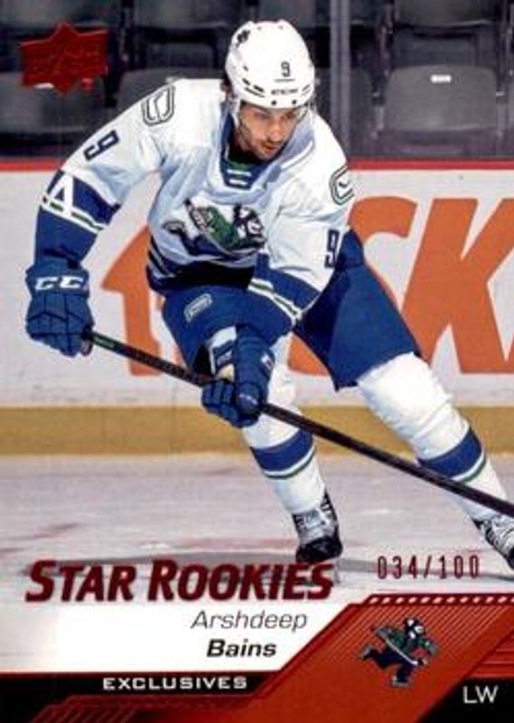 The Arshdeep Bains 2022 Upper Deck AHL #116 Exclusives /100 card is 1 of 9 Arshdeep Bains' card variations in the 2022 Upper Deck AHL set being tracked by Sports Card Investor, including Base, High Gloss /10, Autographs, Blue, and Printing Plates - Black /1.