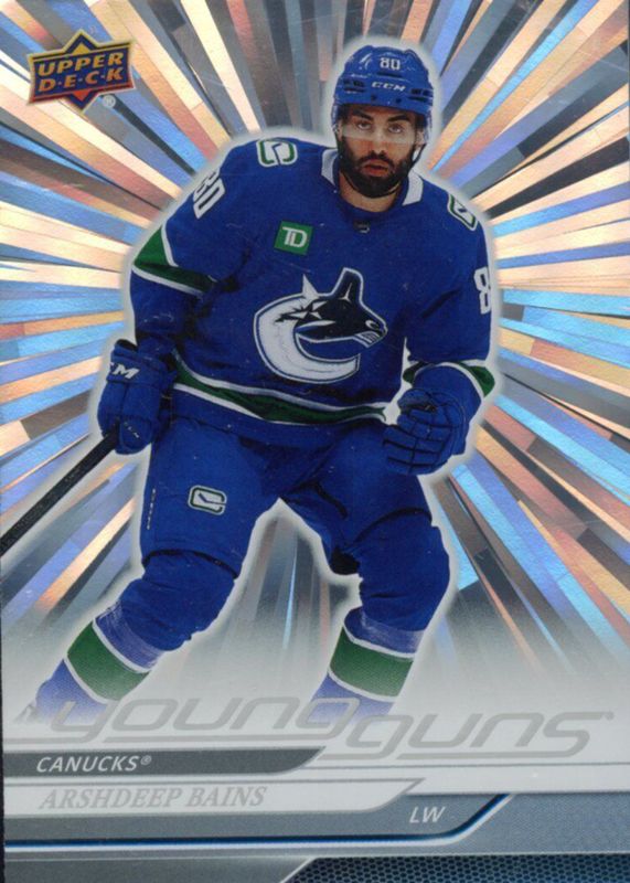 The Arshdeep Bains 2024 Upper Deck #231 Young Guns - Outburst Silver Rookie card in Raw condition has not changed in price in the last 30 days and was last sold for $5.37 .