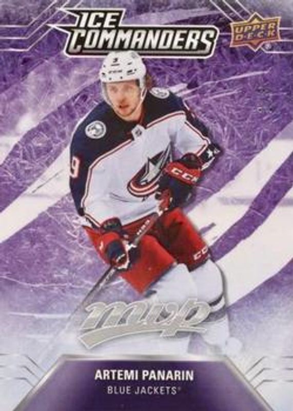 The Artemi Panarin 2019 Upper Deck MVP #IC-16 Ice Commanders Leaderboard Achievements card is 1 of 19 Artemi Panarin's card variations in the 2019 Upper Deck MVP set being tracked by Sports Card Investor, including Base, Blue, Gold Script, Puzzle Backs, and Silver Script.