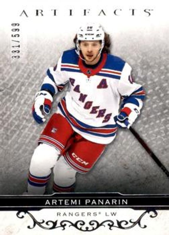 The Artemi Panarin 2021 Upper Deck Artifacts #124 Base /999 card is 1 of 22 Artemi Panarin's card variations in the 2021 Upper Deck Artifacts set being tracked by Sports Card Investor, including Neon Green, Rose Gold, Turquoise, Ruby /499, and Silver Spectrum /299.