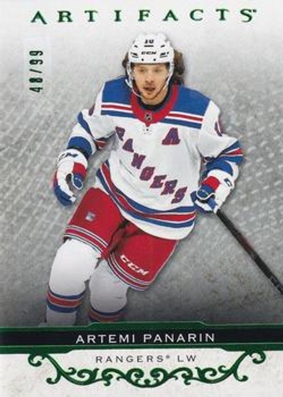 The Artemi Panarin 2021 Upper Deck Artifacts #124 Emerald /99 card is 1 of 22 Artemi Panarin's card variations in the 2021 Upper Deck Artifacts set being tracked by Sports Card Investor, including Base /999, Neon Green, Rose Gold, Turquoise, and Ruby /499.