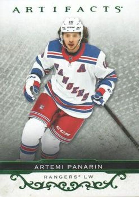 The Artemi Panarin 2021 Upper Deck Artifacts #124 Neon Green card is 1 of 22 Artemi Panarin's card variations in the 2021 Upper Deck Artifacts set being tracked by Sports Card Investor, including Base /999, Rose Gold, Turquoise, Ruby /499, and Silver Spectrum /299.