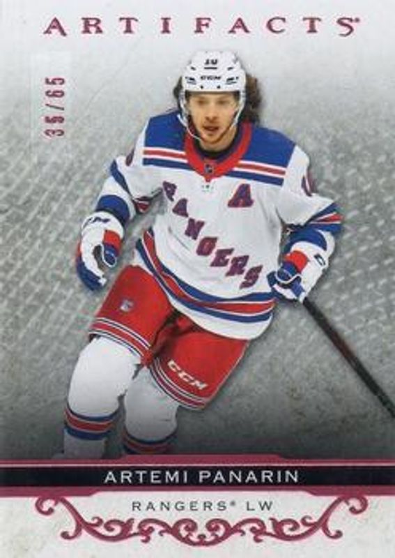 The Artemi Panarin 2021 Upper Deck Artifacts #124 Rose /65 card is 1 of 22 Artemi Panarin's card variations in the 2021 Upper Deck Artifacts set being tracked by Sports Card Investor, including Base /999, Neon Green, Rose Gold, Turquoise, and Ruby /499.
