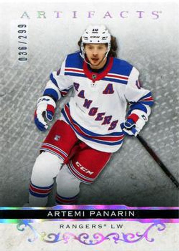The Artemi Panarin 2021 Upper Deck Artifacts #124 Silver Spectrum /299 card is 1 of 22 Artemi Panarin's card variations in the 2021 Upper Deck Artifacts set being tracked by Sports Card Investor, including Base /999, Neon Green, Rose Gold, Turquoise, and Ruby /499.