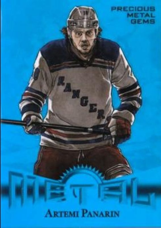 The Artemi Panarin 2022 Metal Universe #RT-6 2013 Retro Precious Metal Gems Blue /50 card is 1 of 22 Artemi Panarin's card variations in the 2022 Metal Universe set being tracked by Sports Card Investor, including Base, Spectrum FX Blue, Spectrum FX Purple /199, Precious Metal Gems Green /100, and Precious Metal Gems Red /100.