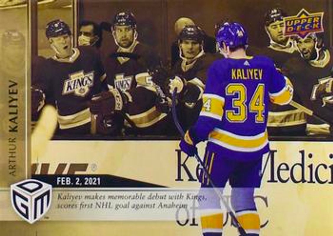 Arthur Kaliyev's Hockey cards are available in at least 39 sets. Arthur Kaliyev's biggest 7-day price movers are 2020 Upper Deck Game Dated Moments #12 Gold, 2020 Upper Deck Game Dated Moments #12 Base, and 2020 Upper Deck Game Dated Moments #12 Autographs Achievements.