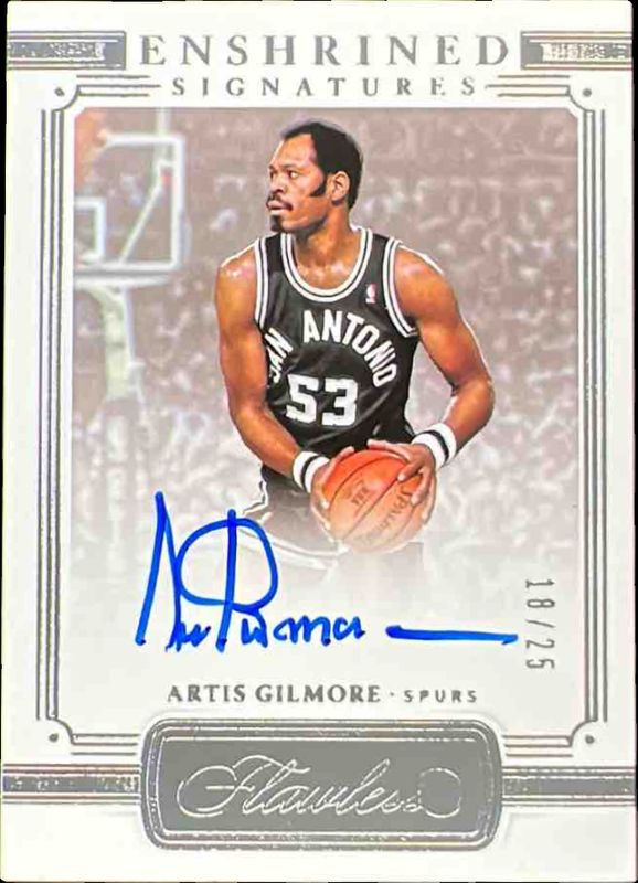 The Artis Gilmore 2020 Flawless #ENS-ART Enshrined Signatures /25 card is 1 of 18 Artis Gilmore's card variations in the 2020 Flawless set being tracked by Sports Card Investor, including Distinguished Autos /25, Legendary Scripts /25, Distinguished Autos - Ruby /15, Enshrined Signatures - Ruby /15, and Legendary Scripts - Ruby /15.