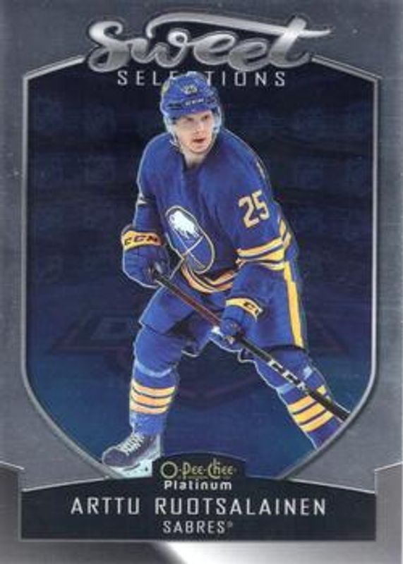 The Arttu Ruotsalainen 2021 O-Pee-Chee Platinum #SS-12 Sweet Selections Rookie card is 1 of 28 Arttu Ruotsalainen's card variations in the 2021 O-Pee-Chee Platinum set being tracked by Sports Card Investor, including Base, Black Shield (Marquee Rookies), Blue Surge, Matte Pink, and Neon Yellow Surge.