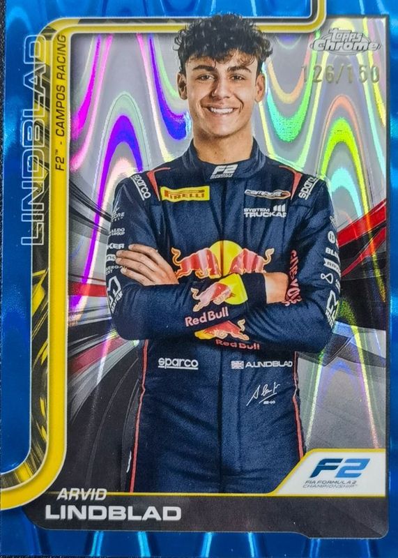 The Arvid Lindblad 2025 Topps Chrome Formula 1 #23 Blue RayWave Refractor /150 card in Raw condition has not changed in price in the last 30 days and was last sold for $12.58 .