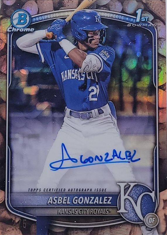 This card is 1 of 31 Asbel Gonzalez's card variations in the 2025 Bowman Chrome set being tracked by Sports Card Investor, including Prospect Auto (1st), Prospect Auto - Black & White Shimmer Refractor (1st), Prospect Auto - Refractor /499 (1st), Prospect Auto - Speckle Refractor /299 (1st), and Prospect Auto - Purple Refractor /250 (1st).