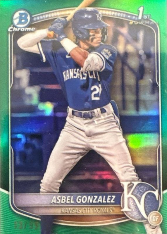 The Asbel Gonzalez 2025 Bowman #BCP-4 Chrome Prospects - Green Refractor /99 (1st) card in Raw condition has not changed in price in the last 30 days and was last sold for $12.00 .