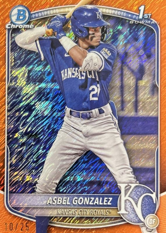The Asbel Gonzalez 2025 Bowman #BCP-4 Chrome Prospects - Orange Shimmer Refractor /25 (1st) card in Raw condition has not changed in price in the last 30 days and was last sold for $20.50 .